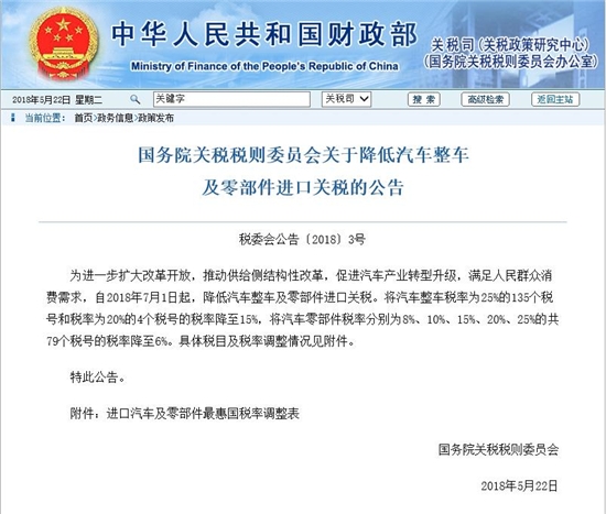 5月22日,國(guó)家財(cái)政部發(fā)布公告,自2018年7月1日起,降低汽車(chē)整車(chē)及零部件進(jìn)口關(guān)稅。將汽車(chē)整車(chē)稅率為25%的135個(gè)稅號(hào)和稅率為20%的4個(gè)稅號(hào)的稅率降至15%,將汽車(chē)零部件稅率分別為8%、10%、15%、20%、25%的共79個(gè)稅號(hào)的稅率降至6%。