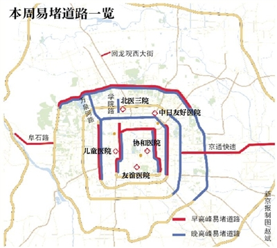 隨著近期氣溫下降,感冒等季節(jié)性疾病高發(fā),各大醫(yī)院就診人數(shù)增多,朝陽安貞地區(qū)、西城月壇地區(qū)、東城王府井地區(qū)的交通壓力較大,預(yù)計工作日上午時段,兒童醫(yī)院、協(xié)和醫(yī)院、中日友好醫(yī)院、友誼醫(yī)院、北醫(yī)三院等醫(yī)院就診人數(shù)增多,周邊交通壓力較大。