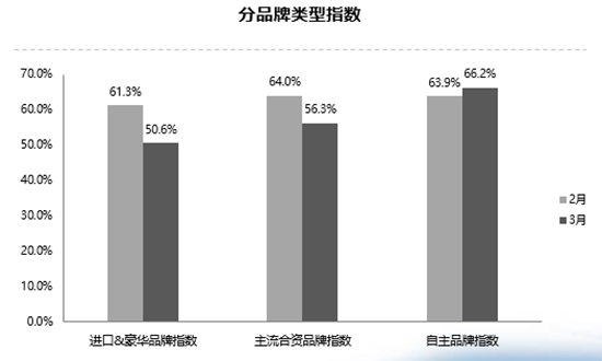 品牌方面,進口&豪華品牌、合資品牌指數(shù)較上月有所下降;自主品牌指數(shù)則居高不下。郎學(xué)紅表示,雖然庫存預(yù)警指數(shù)整體較高,但是進口&豪華品牌已經(jīng)接近臨界值,品牌分化現(xiàn)象變得愈加明顯。