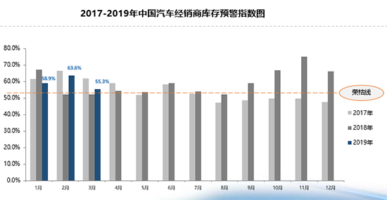 3月,汽車經(jīng)銷商庫存預(yù)警指數(shù)為55.3%,仍然位于警戒線之上。流通協(xié)會方面表示,增值稅下調(diào)及部分地區(qū)國五/國六車型切換導(dǎo)致部分消費者持幣觀望,汽車市場整體銷量不佳。再加上經(jīng)銷商季度末為拿返利主動增加庫存,經(jīng)營壓力仍然較大。