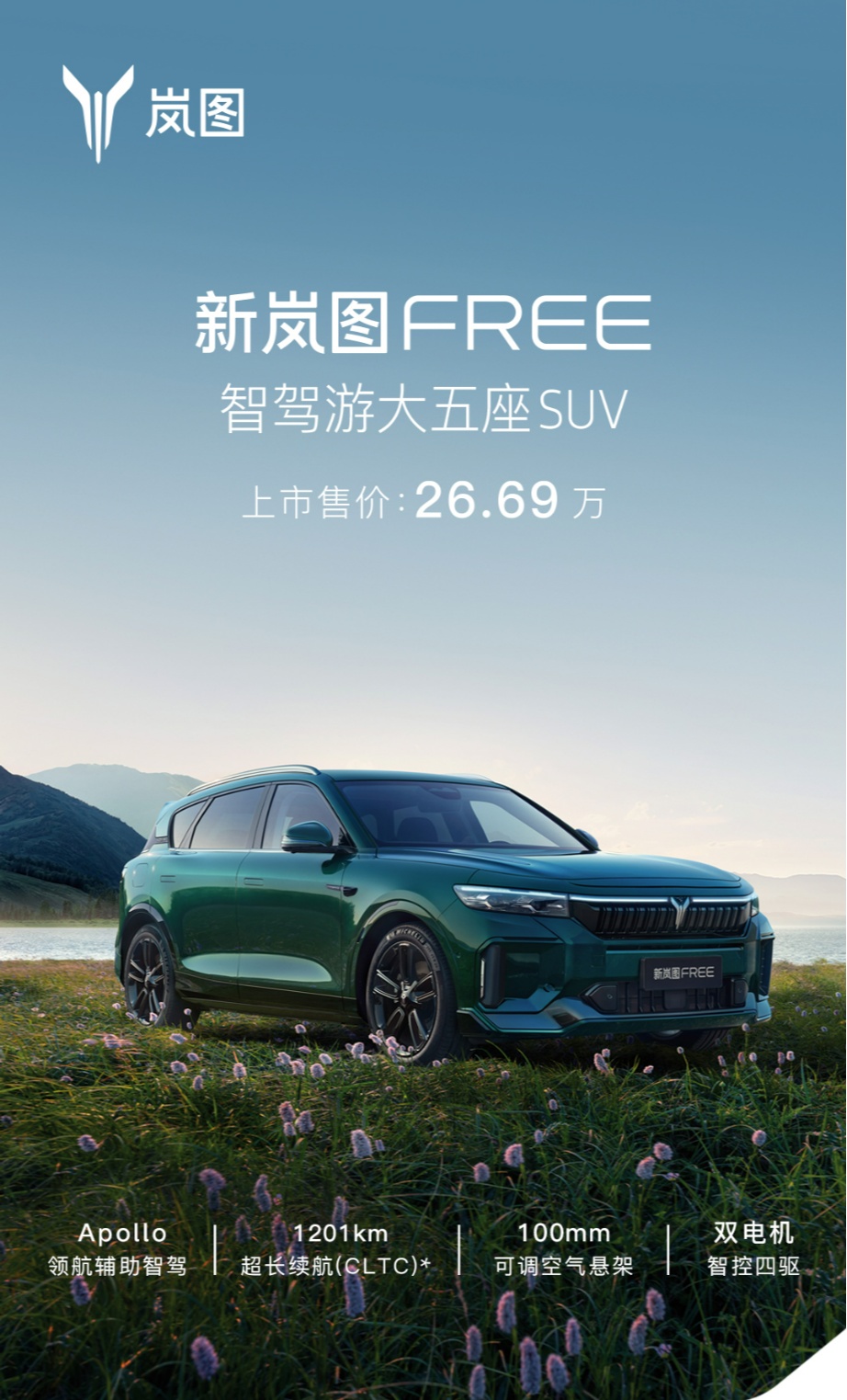 嵐圖汽車CEO盧放表示,作為“智駕游大五座SUV”,新嵐圖FREE的“智”,代表Apollo Highway Driving Pro領(lǐng)航輔助智駕帶來的智駕體驗;“駕”,意味著繼承了嵐圖品牌基因里的駕控實力;“游”,則是超長續(xù)航、超低能耗以及豪華配置帶來的舒適享受。新嵐圖FREE有智慧、有力量、有激情,專為追求自由的“公路旅行家”打造,嵐圖期待與廣大用戶一起,盡情釋放心中的自由,奔赴遠方,開啟人生的“智駕游”。