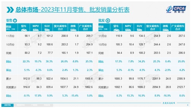 零售方面,據(jù)乘聯(lián)會統(tǒng)計,2023年11月,乘用車市場零售達(dá)到208.0萬輛,同比增長26.0%,環(huán)比增長2.4%。今年累計零售1934.5萬輛,同比增長5.3%。