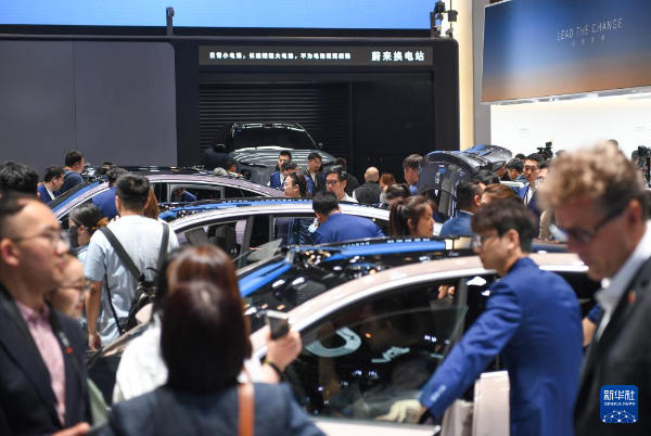 在2024北京車展上,參觀者在蔚來汽車展臺參觀電動汽車換電站演示。新華社記者鞠煥宗攝