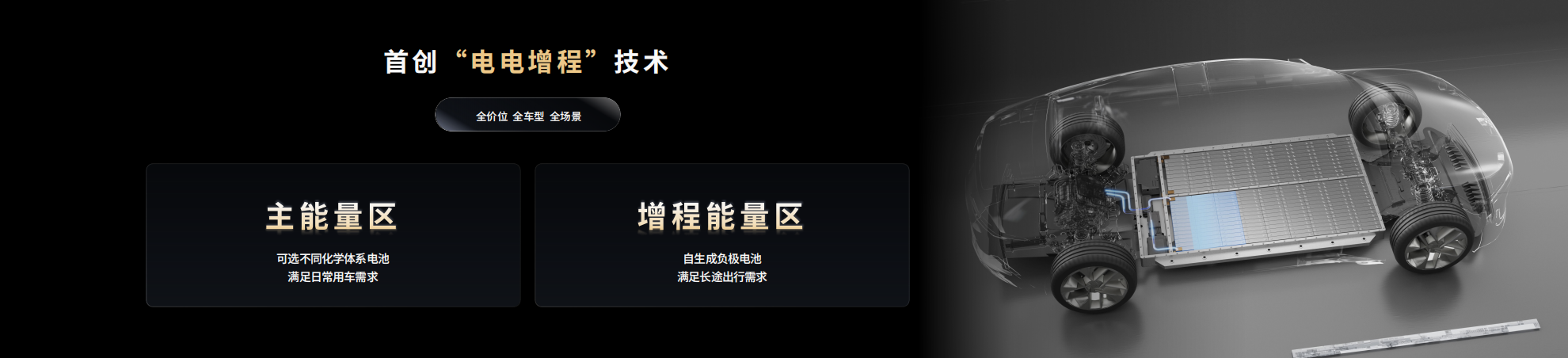 驍遙雙核電池首創(chuàng)的“電電增程”技術(shù),能夠結(jié)合車輛的行駛狀態(tài)和用戶駕駛習(xí)慣,智能調(diào)控兩個能量區(qū)的分配策略。主能量區(qū)可以根據(jù)用戶的駕駛習(xí)慣與場景,適配不同化學(xué)體系的電芯,滿足日常用車需求;增程能量區(qū)可采用高比能自生成負極技術(shù),提供更大的電量,以滿足用戶的長途出行需求。
