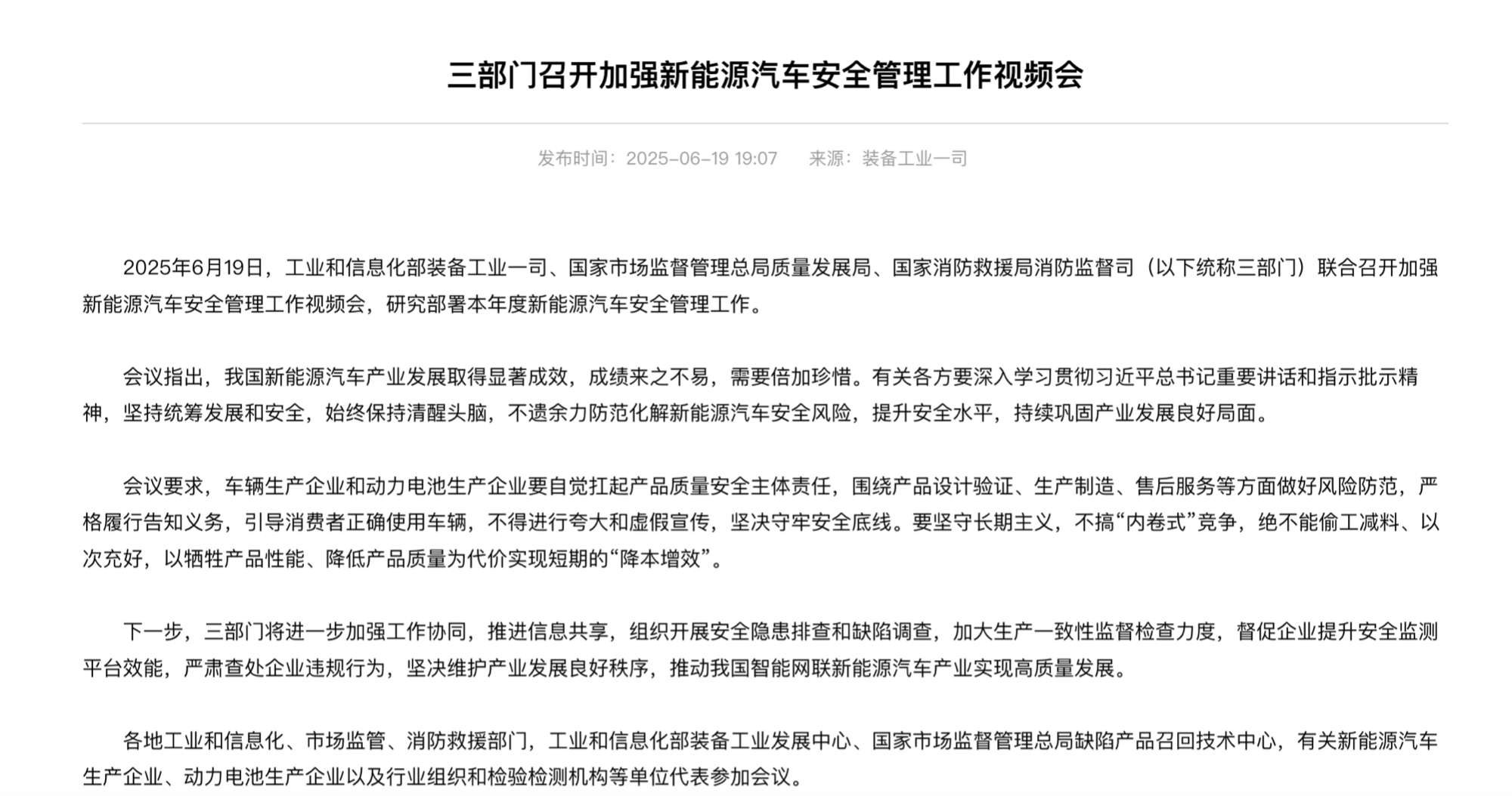 此前(6月9日),工信部已啟動道路機動車輛生產(chǎn)企業(yè)及產(chǎn)品生產(chǎn)一致性監(jiān)督檢查工作,此次三部門聯(lián)合行動進一步加碼新能源生產(chǎn)安全與質(zhì)量管理。