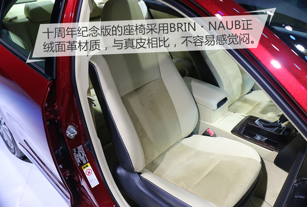 十周年紀(jì)念版凱美瑞將原本就已經(jīng)是真皮包裹的座椅更換了“新裝”,采用了最新研發(fā)的BRIN?NAUB材質(zhì)的正絨面革。與真皮材質(zhì)相比,這種全新的材料不容易有悶的感覺,夏天的時候不會越坐越熱。冬天的時候,剛坐進(jìn)車?yán)镆膊粫杏X特別涼,這樣直接省去了再配坐墊的麻煩。BRIN?NAUB材質(zhì)還具有更好的彈性和延展性,長期坐壓之后不易變形。