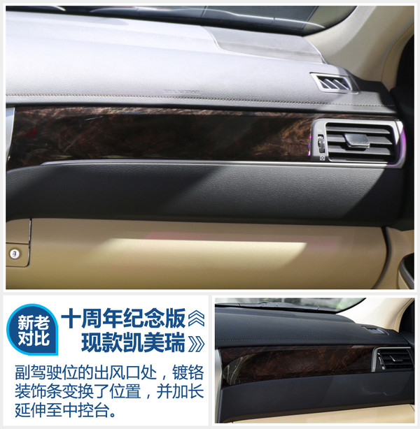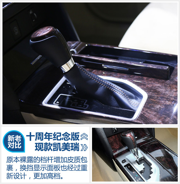 凱美瑞的“蛇形”換擋機(jī)制一直是筆者非常喜歡的設(shè)計,最起碼在開車的時候不會因為換錯擋而發(fā)生意外碰撞。但是說實(shí)話,裸露的檔桿總覺得缺了點(diǎn)什么。十周年紀(jì)念版將檔桿周圍加上了皮質(zhì)包裹,立馬將中控臺的“氣質(zhì)”提升了一個檔次,筆者本人是非常喜歡的。另外,副駕駛面前的木紋面板也增加了一條鍍鉻裝飾。