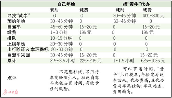 “老車”上線年檢,自己辦與找“黃?!贝k,各自需要占用多少時間和多少支出?給“黃?!钡脑┩麇X,可不可以省下?