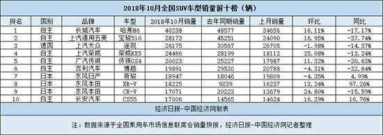 2018年SUV市場的快速冷卻,主要來自于自主品牌的滑落,而至年底,自主品牌也開始拼力自救。10月,自主SUV表現(xiàn)持續(xù)回暖,并共有六款車型入榜SUV銷量前十,但相比去年,表現(xiàn)仍不盡如人意。其中,哈弗H6再現(xiàn)“王者之風”,其10月銷量突破4萬輛,再上一個臺階;接下來,榮威RX5表現(xiàn)非常突出,是榜單中環(huán)比增速最快的車型,排名也上升至歷史新高;此外,在沉淪多月后,長安旗下終于再次有車入榜。