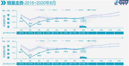 昨日(9月8日),乘用車市場信息聯(lián)席會發(fā)布數(shù)據(jù)顯示,8月,國內(nèi)狹義乘用車銷量達(dá)到170.3萬輛,同比增長8.9%,實現(xiàn)了自2018年5月以來的最強(qiáng)正增長。今年1-8月的零售累計增速下滑15.2%,較1-7月累計增速提升3.3個百分點,體現(xiàn)出行業(yè)的快速回暖態(tài)勢。