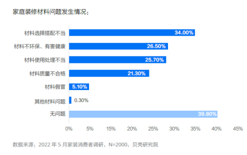 報告顯示,有超過六成的家裝消費者曾遇到過材料問題,其中既有涉及材料本身的問題,例如材料不環(huán)保有害健康(26.5%)、材料質量不合格(21.3%)、以及材料假冒(5.1%);也有涉及材料使用的問題,例如材料選擇搭配不當(34%)、材料使用處理不當(25.7%)等。