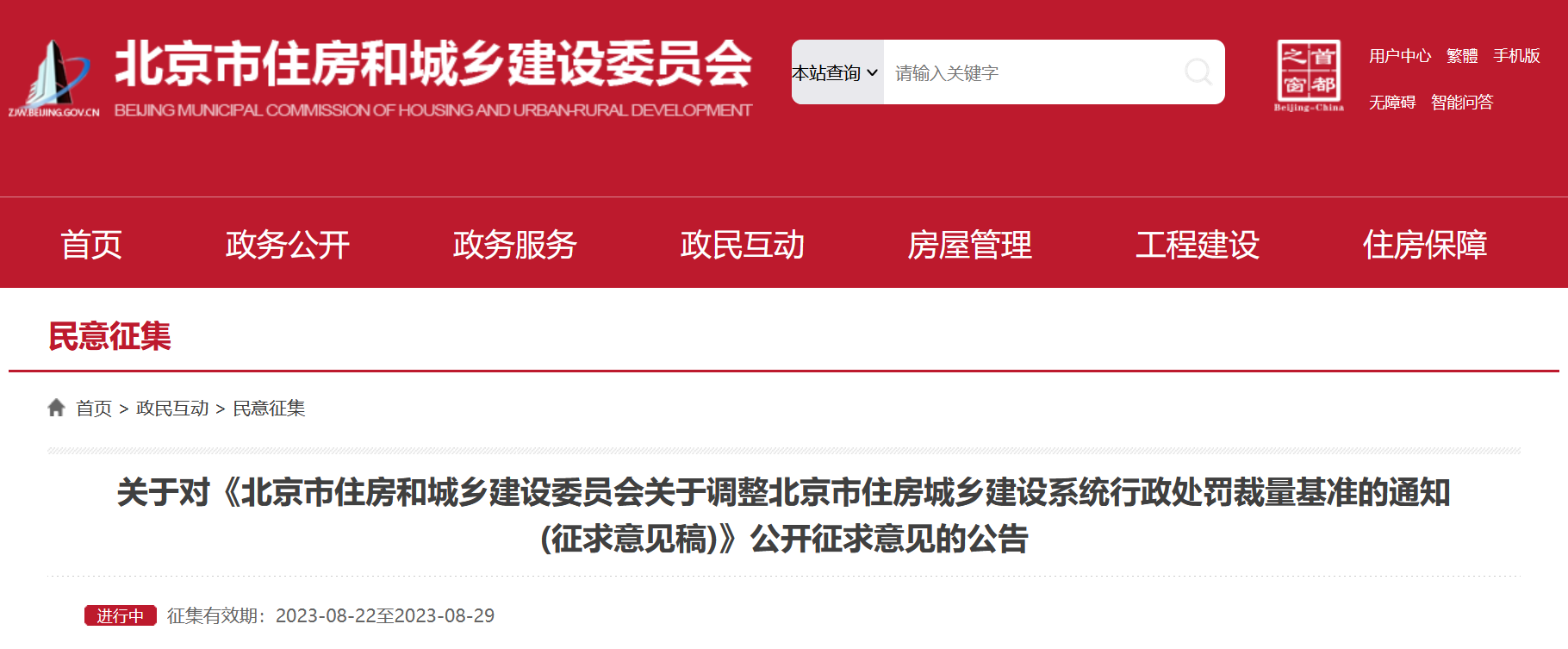央廣網(wǎng)北京8月23日消息 據(jù)北京市住房和城鄉(xiāng)建設(shè)委員網(wǎng)站消息,為貫徹落實(shí)《建設(shè)工程質(zhì)量檢測管理辦法》《房地產(chǎn)開發(fā)企業(yè)資質(zhì)管理規(guī)定》相關(guān)處罰職權(quán),北京市住房和城鄉(xiāng)建設(shè)委員會(huì)制定了《北京市住房和城鄉(xiāng)建設(shè)委員會(huì)關(guān)于調(diào)整北京市住房城鄉(xiāng)建設(shè)系統(tǒng)行政處罰裁量基準(zhǔn)的通知(征求意見稿)》,現(xiàn)向社會(huì)公開征求意見。公開征集意見時(shí)間為:2023年8月22日至8月29日。