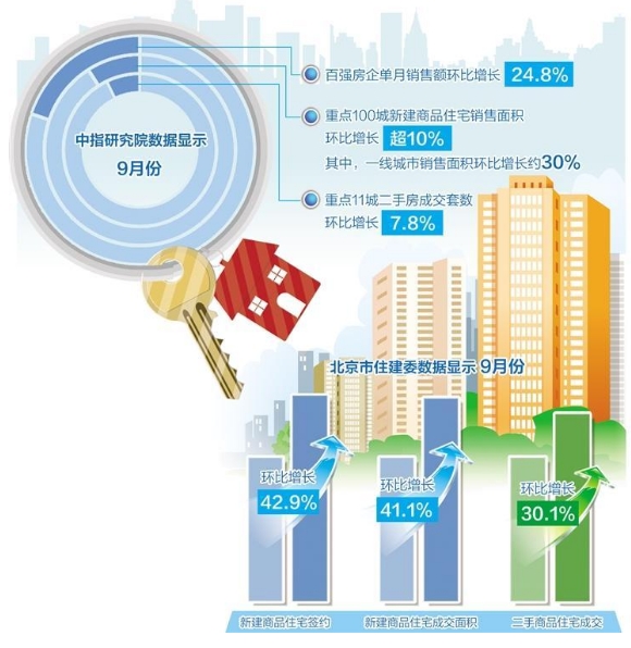隨著需求釋放動(dòng)能減弱,9月后兩周成交量明顯下降。北京市住建委數(shù)據(jù)顯示,9月份,北京新建商品住宅簽約5891套,成交面積67.96萬平方米,環(huán)比分別增長(zhǎng)42.9%和41.1%;二手商品住宅成交14262套,環(huán)比增長(zhǎng)30.1%。
