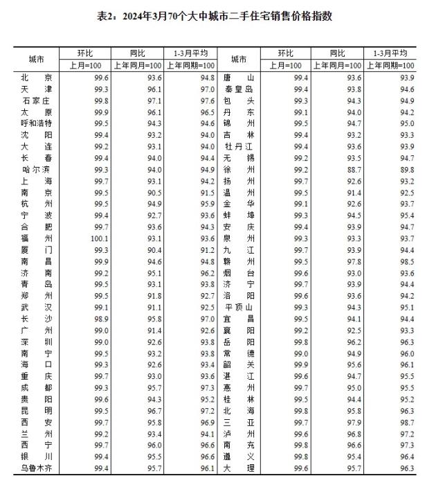 2024年3月70個大中城市二手住宅銷售價(jià)格指數(shù)。 截圖自國家統(tǒng)計(jì)局官網(wǎng)