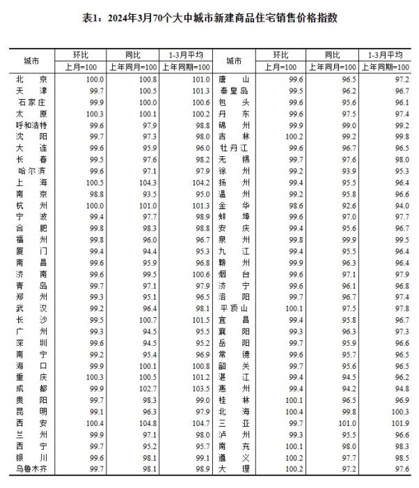 2024年3月70個大中城市新建商品住宅銷售價(jià)格指數(shù)。 截圖自國家統(tǒng)計(jì)局官網(wǎng)