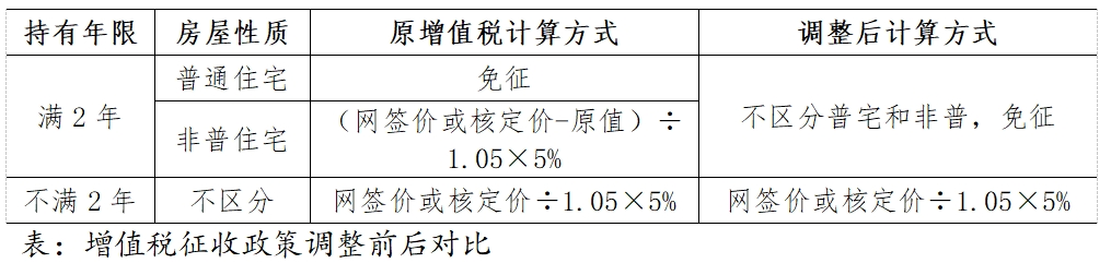 增值稅方面,政策調(diào)整后個人將購買2年以上(含2年)的住房對外銷售的,免征增值稅;個人將購買不足2年的住房對外銷售的,按照5%的征收率全額繳納增值稅。