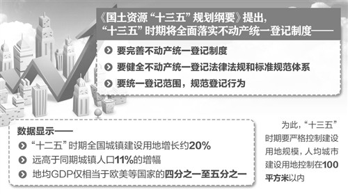 國土資源部今天公布的《國土資源“十三五”規(guī)劃綱要》提出,“十三五”時期將全面落實不動產(chǎn)統(tǒng)一登記制度。
