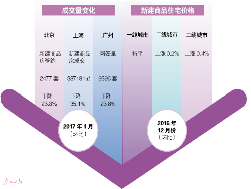 國(guó)家統(tǒng)計(jì)局70個(gè)大中城市住宅銷(xiāo)售價(jià)格統(tǒng)計(jì)數(shù)據(jù)顯示,2016年12月份有46座城市新建商品住宅價(jià)格環(huán)比上漲,2016年11月份為55座城市上漲,價(jià)格環(huán)比上漲的城市個(gè)數(shù)在減少。其中一線(xiàn)城市新建商品住宅價(jià)格環(huán)比由上月的上漲0.1%轉(zhuǎn)為持平;二線(xiàn)城市新建商品住宅價(jià)格上漲0.2%,比上月回落0.2個(gè)百分點(diǎn);三線(xiàn)城市新建商品住宅價(jià)格上漲0.4%,比上月回落0.4個(gè)百分點(diǎn)。15個(gè)一線(xiàn)和熱點(diǎn)二線(xiàn)城市因地制宜、因城施策實(shí)施調(diào)控政策以來(lái),政策效果明顯,房?jī)r(jià)快速趨穩(wěn)回落。其中廣州市已連續(xù)三個(gè)月環(huán)比漲幅回落。