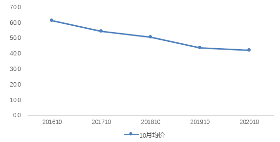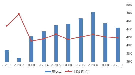 全國351城季度成交規(guī)劃建筑面積及累計同比 數(shù)據(jù)來源:貝殼研究院整理 全國租賃市場:市場漸冷 租金創(chuàng)五年最低值 貝殼研究院數(shù)據(jù)顯示,10月貝殼重點城市租賃市場成交量環(huán)比持續(xù)下降,租金水平同比四連降達(dá)到近五年最低值。從成交量來看,10月租賃成交量環(huán)比下降10.5%,延續(xù)9月的下降態(tài)勢。從租金水平來看,2016-2020年的10月租金四連降,達(dá)到近五年最低。2020年10月重點城市平均月租金為41.8元/平米,環(huán)比下降0.6%,同比下降4.0%。