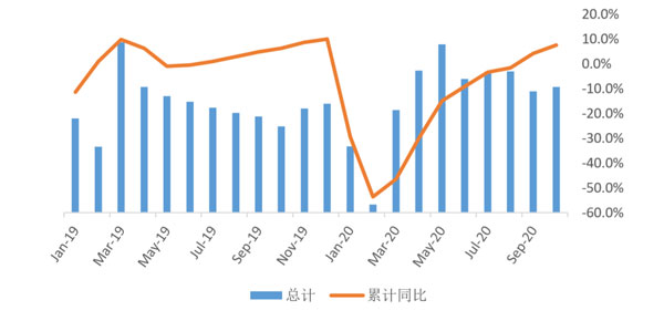 2019年至今66座大中城市中各線級城市合計月度成交套數(shù)累計同比(%) 數(shù)據(jù)來源:WIND,10月全部數(shù)據(jù)為全月預(yù)測值 全國土地市場: 粵港澳大灣區(qū)保持高熱度 貝殼研究院統(tǒng)計整理數(shù)據(jù)顯示,2020年10月(截至10月27日),全國351城整體住宅用地累計成交金額達(dá)4.6萬億元,累計同比增長12.9%。全國351城整體住宅用地累計成交規(guī)劃建筑面積14.6億㎡,累計同比降幅收窄0.6個百分點至2.5%。10月28日至10月31日,計劃出讓6734萬㎡以上,如果順利成交,據(jù)貝殼研究院測算,全國351城整體住宅用地成交規(guī)劃建筑面積累計同將進(jìn)入增長區(qū)間,增長幅度0.1%,市場追平去年同期。從目前的各城市出讓計劃統(tǒng)計可知,11月預(yù)計出讓規(guī)劃建筑面積1.7億㎡的住宅用地,如果全部成交,11月的住宅用地規(guī)劃建筑面積累計同比將增長1.2%。 2020年1-10月,粵港澳、哈長城市群成交量累計同比表現(xiàn)突出,城市群住宅用地成交金額及規(guī)劃建筑面積累計同比收窄之后,10月略有反彈。其中粵港澳大灣區(qū)成交金額累計同比、成交規(guī)劃建筑面積累計同比均排在第一位,隨著廣州、東莞、佛山、深圳等城市加大供應(yīng),住宅用地市場熱度較高。