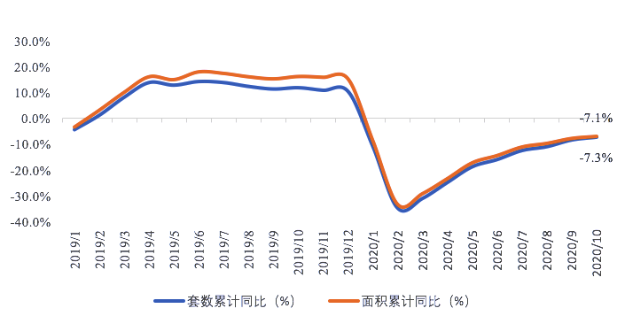 2019年至今66座大中城市合計月度成交套數(shù)與成交面積累計同比 (數(shù)據(jù)來源:WIND,10月數(shù)據(jù)為全月預(yù)測值) 貝殼研究院統(tǒng)計整理數(shù)據(jù)顯示,截止2020年10月一線城市新房市場成交量恢復(fù)逐漸放緩,其中成交套數(shù)累計同比下滑2.8%、成交面積累計同比下滑1.8%;二線城市成交套數(shù)累計同比下滑8.4%、成交面積累計同比下滑9.5%;三四線城市成交套數(shù)累計同比下滑6.8%、成交面積累計同比下滑4.4%。整體環(huán)比9月基本持平。一線城市新房市場10月持續(xù)領(lǐng)跑全國,二線以下城市累計成交量同比下滑幅度持續(xù)穩(wěn)定,調(diào)控升級后,市場動力一般。