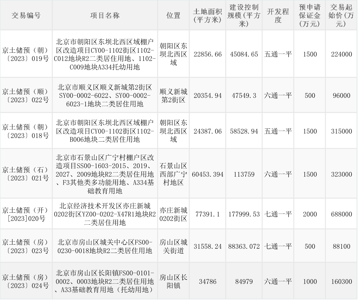 央廣網北京5月8日消息 5月6日晚間,北京市規(guī)劃和自然委員會掛牌7宗預申請住宅用地。其中,朝陽區(qū)、房山區(qū)各兩宗,經開區(qū)、順義區(qū)、石景山區(qū)各一宗,總土地面積約27.18萬平方米,總建設控制規(guī)模約61.63萬平方米,總起始價189.44億元。