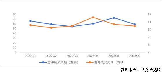 房客源活躍度提升,房屋出租周期先升后降。根據(jù)貝殼研究院數(shù)據(jù),2023年上半年重點(diǎn)40城新增掛牌房源量、新增帶看客戶量同比、環(huán)比均增加超過9%。房源端、客源端活躍度均保持上升的趨勢。2023年上半年重點(diǎn)40城房客源成交周期分別為65.0天、10.5天。相比于去年,今年上半年房源成交周期總體有所延長。從季度來看,房源供應(yīng)量的增加同時使得2023年一季度房屋出租周期比2022年四季度上升12.1天,但2023年二季度房源成交周期比一季度縮短13.6天,出房速度有所加快。從客源端來看,一、二季度客源成交周期連續(xù)縮短,顯示出租客的租房難度在降低,可選擇房源量較多,有利于租客選擇匹配自身需求的房源。