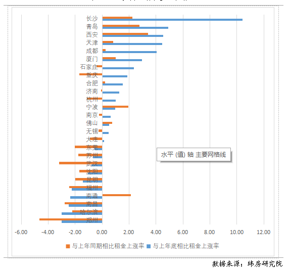 二線城市上半年住房租金漲跌參半,但多數(shù)城市未達(dá)到去年同期水平。與上年末相比,住房大數(shù)據(jù)監(jiān)測的26個二線城市中,有10個城市住房租金下降,16個城市住房租金上漲。其中,鄭州、哈爾濱、南昌等城市的住房租金降幅最大;長沙、青島、西安、天津、成都等城市漲幅在4%以上。