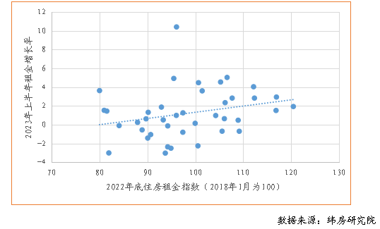 住房租金漲幅呈現(xiàn)分化態(tài)勢,表現(xiàn)出“快者恒快、慢者恒慢”的現(xiàn)象。過去四年住房租金漲幅快的城市,2023上半年漲幅依然相對較快;而過去四年住房租金漲幅相對較慢的城市,2023上半年漲幅依然相對較慢。