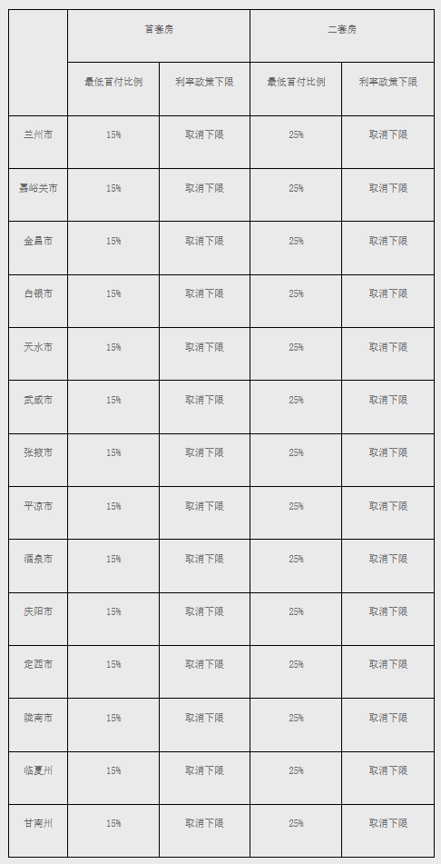 貸款利率政策下限方面:(一)蘭州、白銀、平?jīng)?市,在前期已取消首套住房商業(yè)性個人住房貸款利率政策下限的基礎上,取消二套住房商業(yè)性個人住房貸款利率政策下限。(二)嘉峪關、金昌、天水、武威、張掖、酒泉、慶陽、定西、隴南、臨夏、甘南等11個市州,取消首套和二套住房商業(yè)性個人住房貸款利率政策下限。在本政策范圍內,各行可結合本機構經(jīng)營狀況、客戶風險等因素,合理確定每筆貸款的具體利率水平。