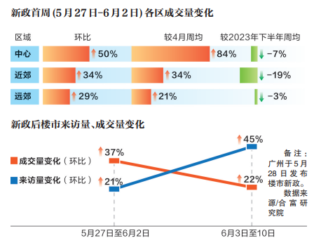 廣州“5·28”新政后,市場反應(yīng)確實(shí)很積極。據(jù)合富研究院監(jiān)測(cè),“5·28”新政落地,連續(xù)政策利好刺激下全市成交(基于認(rèn)購數(shù)據(jù))階梯式上漲。5月27日至6月2日,來訪、成交環(huán)比分別上升21%、37%。各區(qū)域成交熱度均有改善,中心區(qū)域成交環(huán)比上升50%,多個(gè)熱盤如天河區(qū)越秀·觀樾,海珠區(qū)保利燕語堂悅、琶洲南TOD,荔灣區(qū)保利和頌等單周成交超20套。近郊、遠(yuǎn)郊成交環(huán)比分別上升34%及29%。此外,6月3日至10日,廣州樓市熱度持續(xù)活躍,來訪量比前一周上漲45%,成交量(基于認(rèn)購規(guī)模統(tǒng)計(jì))環(huán)比上升22%;近郊黃埔、番禺來訪人氣環(huán)比均有不同程度上升,成交量比前一周上漲27%。