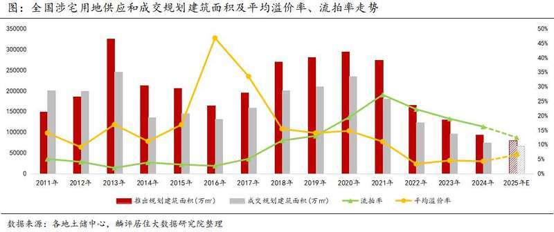 剛剛過去的2024年,全國土地市場供需兩端延續(xù)縮量態(tài)勢,溢價率低位徘徊,流拍率雖有下降但仍處于較高位。據(jù)機構(gòu)統(tǒng)計,2024年全國住宅用地成交規(guī)模降幅超兩成,土地出讓金僅為2020年高點四成左右。聚焦高能級城市拿地投資,成為眾多房地產(chǎn)企業(yè)的共識。