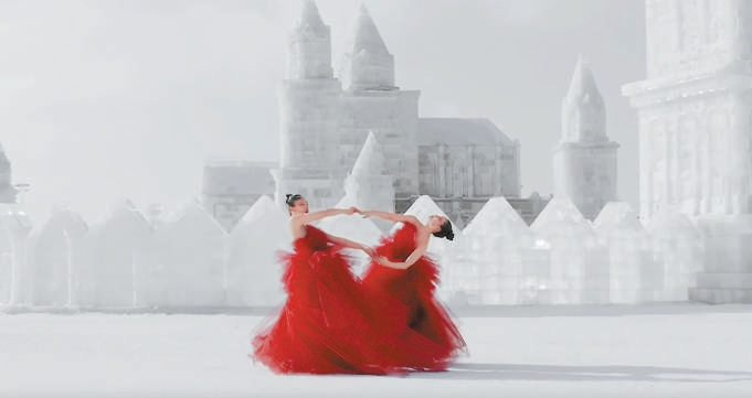 2021年,某時尚品牌的一則創(chuàng)意視頻《開放空間》火遍網絡。視頻中,幾位舞者在麥田、湖泊上奔跑、飛翔、翻滾,每一位舞者如同精靈,那種逐風的自由讓無數觀眾眼前一亮,仿佛夢境成真。2022年,舞蹈影像導演李翠穎創(chuàng)作的《映雪紅珊》堪為黑龍江的絕美宣傳片。作品中,兩位身著夸張紅舞裙的舞者,在肅穆的冰雪世界中緩慢起舞,當呼吸凝成霧氣,冰封的大地如銀河一般靜寂,兩朵“紅梅”在凜冽與寂靜中開放,展現出中國極北之地的堅韌之美。