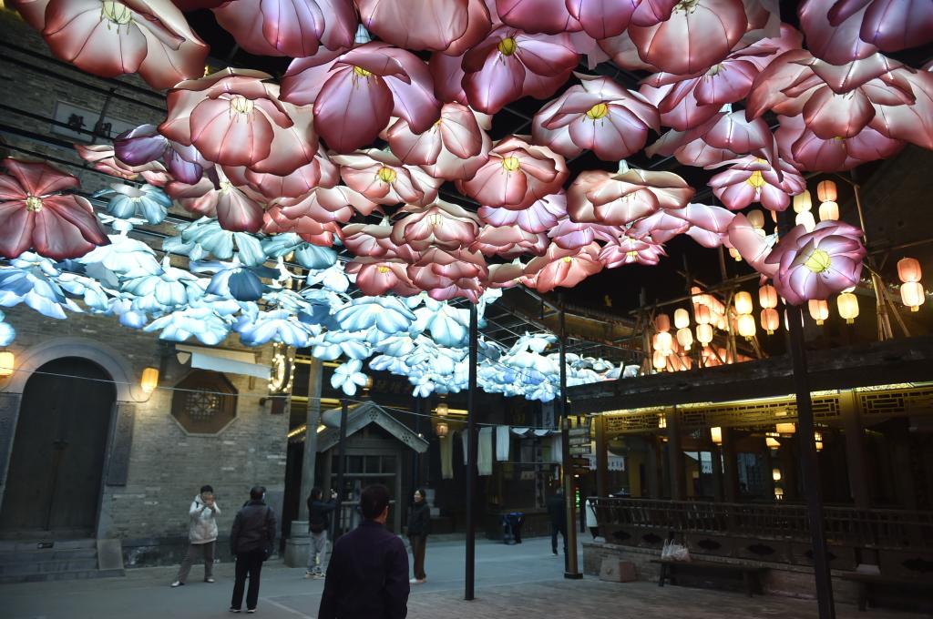 11月16日晚,游人在建業(yè)電影小鎮(zhèn)內(nèi)游覽拍照。新華社記者 魯鵬 攝