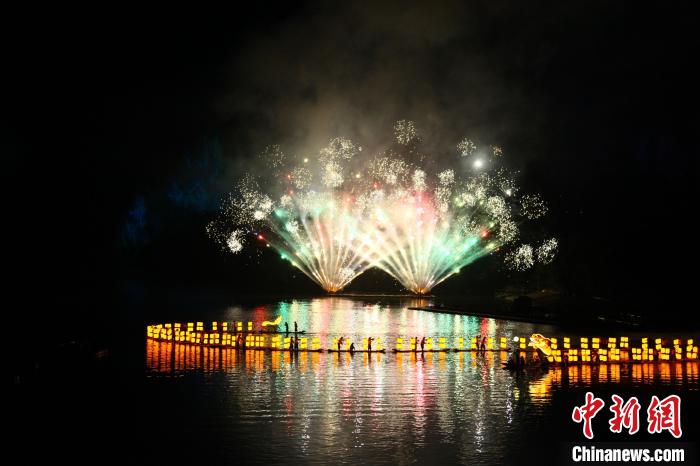 《印象·劉三姐》歡慶公演20周年。 周利朔 攝 慶典演出現(xiàn)場人頭攢動,開場無人機表演在半空組合出紀念“印象劉三姐20年”的圖案,舞臺上擊鼓而舞的表演者渲染歡樂氛圍。以絢爛煙火為背景,漁翁表演者在江面組成蜿蜒長龍,引得游客們紛紛贊嘆拍照。慶典演出環(huán)節(jié),桂林旅游學院和《印象·劉三姐》的演員們共同表演的舞蹈《漓江·春茶》、百人合唱《侗族大歌》、實景展演《龍騰印象》等精彩節(jié)目,帶來一場視覺盛宴。 20周年慶期間,《印象·劉三姐》園區(qū)特別增設(shè)互動體驗項目和美陳裝置,旨在提升中外游客的參與感和體驗感。在園區(qū),項目首次設(shè)立“打歌臺”,帶來豐富有趣的山歌互動活動,讓游客親身體驗山歌演唱的魅力,進一步拉近觀眾與藝術(shù)的距離。