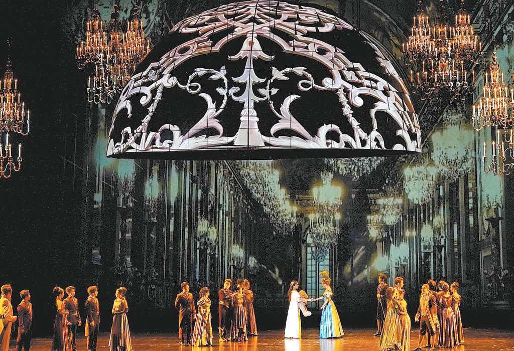 與壯闊宏大的作品立意相匹配的,是當(dāng)?shù)闷鹑A美二字的舞臺(tái)呈現(xiàn)。璀璨的吊燈、長(zhǎng)長(zhǎng)的樓梯等鮮明意象不斷出現(xiàn),簡(jiǎn)潔的布景與流動(dòng)的影像虛實(shí)交織,把輝煌的宮廷、幽靜的鄉(xiāng)村、無垠的星空等場(chǎng)景營造得深邃動(dòng)人。其中,由多塊LED屏拼成的圓弧最引人注目,在舞美設(shè)計(jì)維亞切斯拉夫·奧庫涅夫的解讀中,和平的寧靜短暫降臨時(shí),圓弧可以隨影像變幻為宮殿穹頂、簡(jiǎn)潔的花園涼亭,為生活遮風(fēng)擋雨;戰(zhàn)爭(zhēng)襲來,刺目的紅光從破裂崩碎的圓弧中迸濺而出,恰如滿目瘡痍、生靈涂炭的現(xiàn)實(shí)。最終,幾瓣圓弧拼成碧水青山的“地球”,呼應(yīng)原著小說標(biāo)題中的俄語單詞“Mip”,即“世界”,將作品的意境再次推上新的高點(diǎn)。