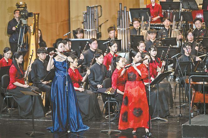 展現(xiàn)“潮”與“年輕態(tài)”的當代民樂作品——雙竹笛協(xié)奏曲《熱情與冷漠的邂逅》融入了南音元素。(廈門日報記者 林銘鴻 攝)