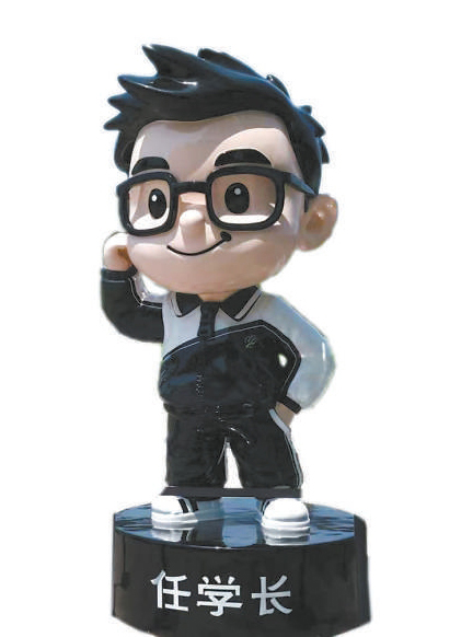 走進北海公園南門,步行沒多遠,就能看見一個兩人高的公仔矗立湖邊。公仔底座上寫著“任學(xué)長”,他戴著黑框眼鏡,弧形上翹的嘴型仿佛向游客笑著問好,沿著它背后的湖水碧波望去,遠處就是北海的白塔,為寧靜典雅的古典園林增添了一絲可愛氣息。