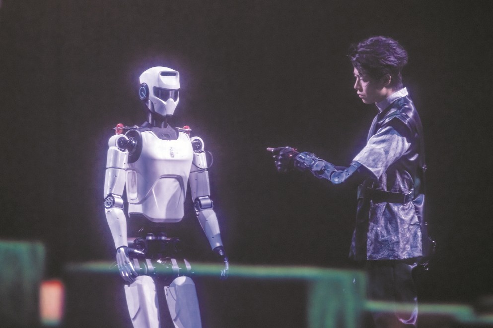 這是發(fā)生在中國大戲院長三角城市戲劇節(jié)中的最“科幻”一幕,國內(nèi)領(lǐng)先的機(jī)器人走出實(shí)驗(yàn)室和展廳,以接地氣、親和的方式來到普通人身邊。面對這樣的場景,人們不再那么陌生——2025春晚上,張藝謀導(dǎo)演的《秧BOT》讓人形機(jī)器人略顯滑稽地扭起秧歌;上半年,半程馬拉松也迎來人形機(jī)器人“跌跌撞撞”的身影?!拔覀冊谔剿饕环N可能性,試著模擬發(fā)生在未來的場景。”《巨物之城》藝術(shù)總監(jiān)、上海戲劇學(xué)院藝術(shù)科技與管理學(xué)院副院長沈倩對記者說,“無論對于機(jī)器人還是演藝產(chǎn)業(yè)來說,都具有破圈的意義?!闭\然,機(jī)器人仍在亦步亦趨地努力跟上人類的節(jié)奏,但其不斷前進(jìn)的腳步已經(jīng)令人激動。面對“人機(jī)共生”的時代命題,上海邁出了全國舞臺實(shí)踐的第一步。