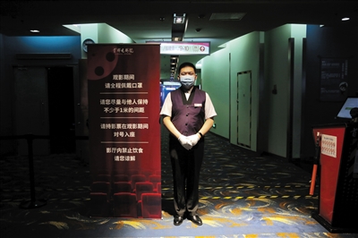 北京首都電影院西單店的工作人員站在影廳門口提示觀眾觀影安全事項。 新京報記者 鄭新洽 攝