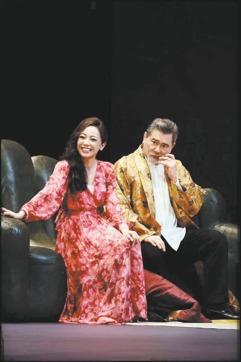 打磨人物,不僅要貼近人物的內(nèi)心,還要轉(zhuǎn)化生成一套獨特的表演語法,才能引發(fā)觀眾的震顫?!恩{魚》中的人物設(shè)計相當現(xiàn)代。角色固然有其姓名,但在稱呼上卻體現(xiàn)為復(fù)雜身份的交替,例如單無憚:一會兒是落馬失勢、人人喊打的“市長”,一會兒是家中掌權(quán)、威風凜凜的“老爺”,一會兒又是唯利是圖、眾叛親離的“舅舅”,如此微妙的心態(tài)變化,皆要演員下足功夫,琢磨人物的一舉一動。趙文瑄與鄧萃雯兩位演員,在人物口音塑造上花了不少心思。趙文瑄談吐論說時,既要保留那種拿腔作勢,又要有自詡為詩人的韻律感,所以必須格外注重每一句話的重音位置,才能使臺詞成為動作性的表達。鄧萃雯的“港普”暗示了人物復(fù)雜的身份經(jīng)歷,為了表現(xiàn)出瘦馬這一“情婦”角色獨有的悲涼感,她在形體表現(xiàn)上的婀娜多姿、風情萬種,也與語言上的牙尖嘴利、咄咄逼人形成反差,展現(xiàn)出了人物可氣與可悲的矛盾處境。