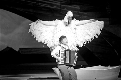 最具情趣的莫過于由北京京劇院武丑演員曹陽陽帶領(lǐng)一眾北戲?qū)W生演出的大鵝,身披潔白羽毛憨態(tài)可掬。這也是曹陽陽從藝以來第一次在舞臺上以動物的形態(tài)進行表演。這個與主角林大林互動最多的角色,既要化身林大林渴望的父愛,又是他孤單時的玩伴。在模仿大鵝走路的過程中,曹陽陽便用上了京劇武丑的技巧。其中一場水中救人的段落,他甚至還要從兩米多高的橋上展開翅膀飛身下去,對京劇下高、空翻技巧有了全新的展示。