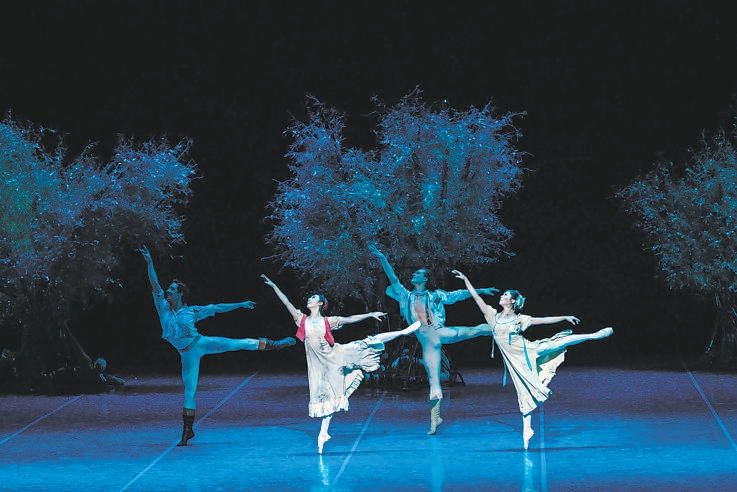 隨著希波呂忒沉沉睡去,舞臺(tái)瞬間轉(zhuǎn)變?yōu)樯衩氐哪Хㄊ澜?。由埃德溫·列瓦佐夫扮演的仙王奧布朗與安娜·勞德雷扮演的仙后提泰妮婭,通過一段充滿對抗的雙人舞烘托出雙方的緊張氛圍,高難度的托舉完成得默契十足,展現(xiàn)了一流舞團(tuán)首席舞者的深厚功底。四位戀人錯(cuò)綜復(fù)雜的情感糾葛,墜入愛河的甜蜜,愛錯(cuò)人與不被愛的痛與恨都在肢體語言中得以流露,在愛情之花的魔力下,戀人們陷入混亂,編織出一場超越現(xiàn)實(shí)的夢境。