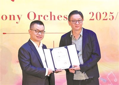 中國交響樂團黨委書記周宇(左)為著名小提琴家陸威頒發(fā)客座首席聘書。攝影/羅維