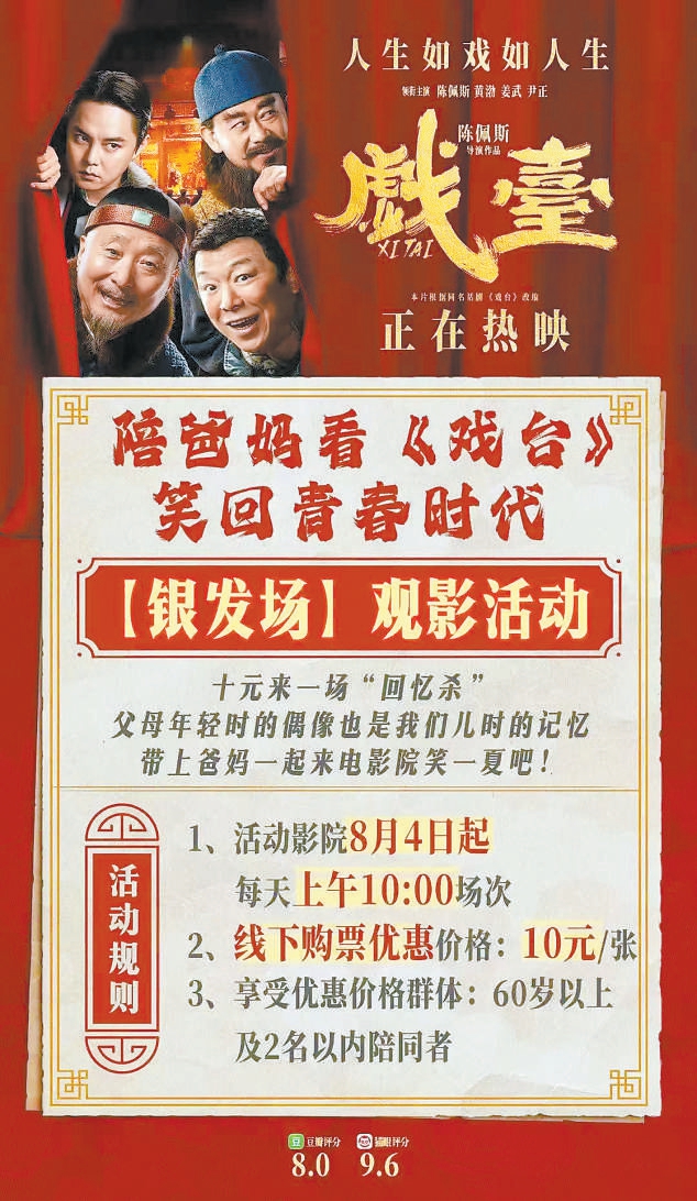 《戲臺》則推出“銀發(fā)場”特惠活動?!靶Ч貏e好,線上線下都傳開了,很多觀眾打電話來咨詢?!瘪T賀楠說,北京大約四分之一的影院都有“銀發(fā)場”,他所在影院的“銀發(fā)場”上座率在《戲臺》所有場次中是最高的。 (北京晚報記者 袁云兒)