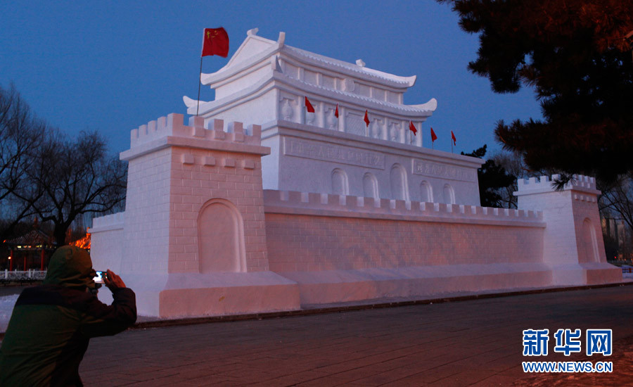 長春南湖公園打造雪雕版“天安門城樓”
