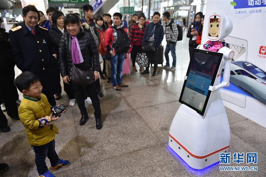2月1日,旅客們在廣州南站與智能機器人“小璐”對話。當日,一臺名叫“小璐”的智能機器人亮相廣州南站,吸引了大批旅客的圍觀,大家紛紛嘗試與“小璐”對話,向她咨詢列車時刻、購票信息、天氣情況等問題,“小璐”不僅可以用甜美的女聲一一作答,還可以在接收到語音指令后,為旅客“唱歌”和“跳舞”。據(jù)了解,使用智能機器人服務旅客是廣州南站在今年春運中的新嘗試,如果試用效果良好,今后有望在車站中看到更多智能機器人的身影。新華社記者 梁旭 攝