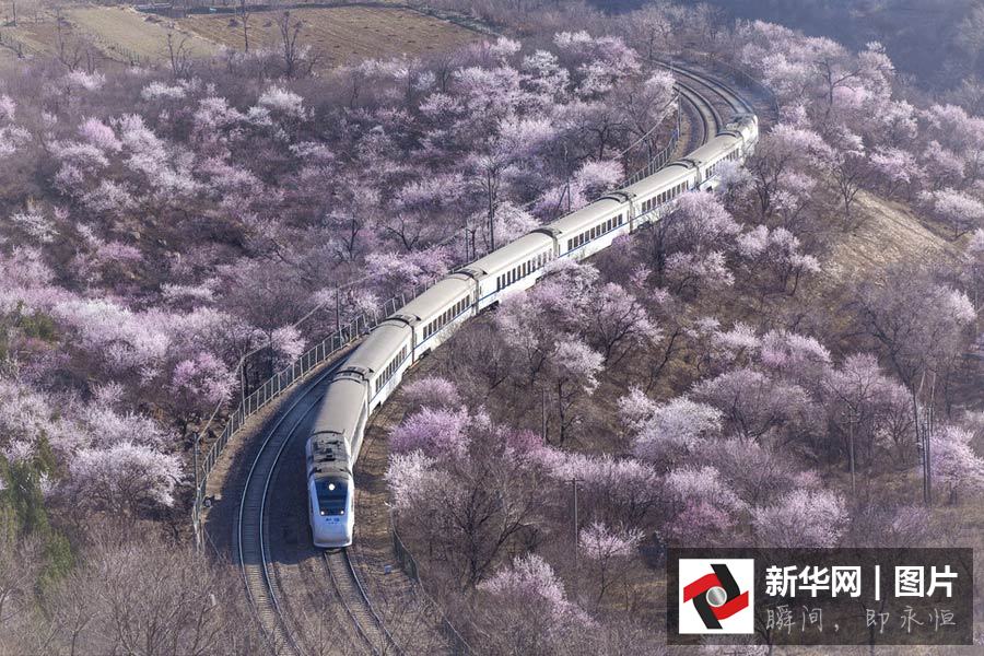 2016年3月23日,中國(guó)北京,又到一年花開時(shí),數(shù)京城最美的鐵路景色還看京張鐵路居庸關(guān)。漫山遍野的桃花盛開,S2雪白的列車穿行其中,美不勝收。圖片來(lái)源:東方IC