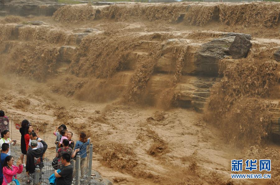 受上游強(qiáng)降雨影響,黃河壺口瀑布水勢(shì)大漲,主副瀑布連成一片。