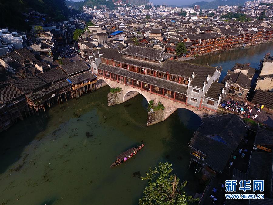 這是鳳凰古城標(biāo)志性建筑之一的虹橋全景(7月28日攝)。鳳凰古城位于湖南省湘西土家族苗族自治州鳳凰縣境內(nèi),是國家歷史文化名城。古城緊鄰沱江而建,吊腳木樓布滿山坡,風(fēng)景秀麗。 新華社記者龍弘濤 攝